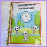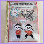 O livro tem 12 páginas, mais a capa. Cada página com um elemento para colar ou fazer a colagem com velcro, tornando interativo.